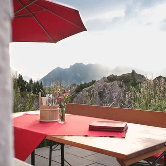 Das alpine Ambiente mit seiner gemütlich-traditionellen Architektur macht den besonderen Charme der Hütte aus. Hier zählen die einfachen Dinge – hausgemachte Spezialitäten wie Käsknöpfle, Brettljause, deftiger Hüttentopf oder Kaiserschmarrn. Dazu gesellen ausgesuchte Tropfen aus dem berühmten Weinkeller des Burg Hotels.