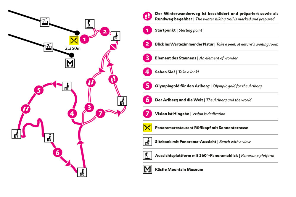 Der inszenierte Winterwanderweg startet bei der Bergstation der Rüfikopfbahn und führt über das Sonnenplateau am Rüfikopf. Entlang des Rundwegs vermitteln verschiedene Stationen spannende Einblicke in das faszinierende Element Schnee und stellen Persönlichkeiten vom Arlberg vor.