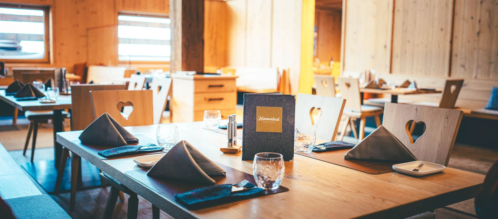 Altholz, Schindeln und Glas prägen das Bedienungsrestaurant Himmeleck von außen, innen punktet es mit Tiroler Gemütlichkeit. In den einladenden Stuben oder bei Schönwetter auf der herrlichen Sonnenterrasse servieren Valentino Schwarz und sein Team traditionelle regionale Köstlichkeiten, begleitet von einer großen Auswahl an vorwiegend österreichischen Weinen. Selbstverständlich darf nach echter Tiroler Tradition auch der himmlisch süße Abschluss nicht fehlen. Freuen Sie sich auf Ruhe und Genuss sowie echte Gastfreundschaft und reservieren Sie am besten rechtzeitig Ihren Tisch.